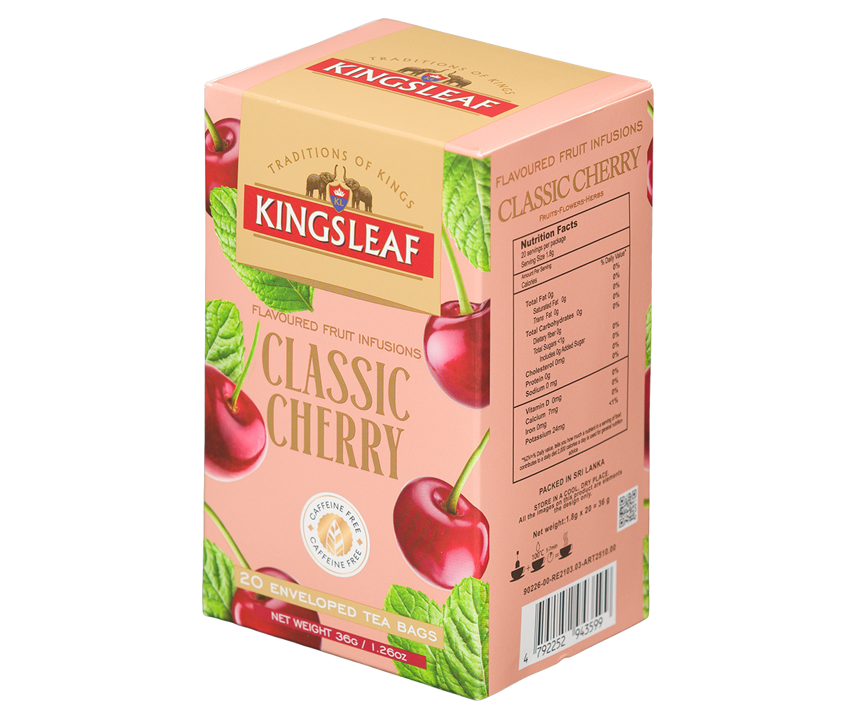 Dive into the timeless flavour of classic cherries, crafted to make every sip feel like a royal celebration. This vibrant caffeine-free infusion blends the rich, sweet taste of cherries with a burst of juicy fruitiness that dances on your palate. Each tea bag is packed in a sealed envelope to lock in freshness and flavour, so you can enjoy a smooth and delicious cup anytime. Enjoy it hot like a queen or chilled like a king, a perfect royal treat to brighten your day.